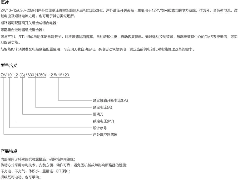 ZW10- 12/630-20系列户外交流高压真空断路器系三相交流50Hz,户外高压开关设备,主要用于12KV农网和城网的电力系统,作为分、合负荷电流、过载电流及短路电流之用,也可用于其它类似场所。
