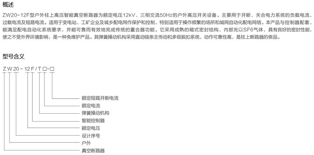 ZW20- 12F型户外柱上高压智能真空断路器为额定电压12kV、三相交流50Hz的户外高压开关设备。主要用于开断、关合电力系统的负载电流、过载电流及短路电流。适用于变电站、工矿企业及城乡配电网作保护和控制,特别适用于操作频繁的场所和城网自动化配电网络。本产品与控制器配套,能满足配电自动化系统要求,并能可靠而有效地完成传统的重合器功能。它采用成熟的箱式密封结构,内部充以SF6气体,具有良好的密封性能,使之不受外界环境影响,是一种免维护产品。其弹簧操动机构采用直动链条主传动和多级脱扣系统,动作可靠性高,是柱上断路器的佳品。